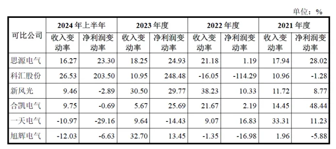 而旭辉电气在图表下文补充称,2021年至2023年及2024年上半年,同行业可比公司的经营业绩变动无一致趋势,主要系经营规模、产品结构和客户类别不同所致。公司最近三年经营业绩变动趋势与科汇股份较为一致,与同行业可比公司相比无重大异常。
