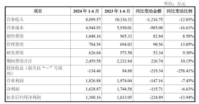 2024年上半年,公司各项期间费用合计为2459.58万元,同比增长10.15%。其中,销售费用为1048.16万,同比增长8.58%;研发费用为626.84万,同比增长9.30%。